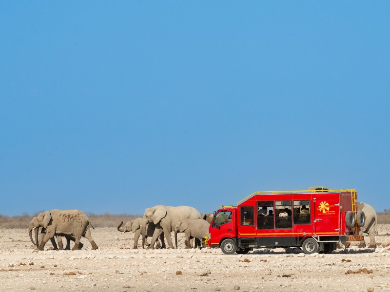 Der gesamte Tag steht im Zeichen intensiver Tierbeobachtungen. Auf ausgedehnten Pirschfahrten erkunden Sie verschiedene Regionen des Parks und verweilen an Wasserlöchern, wo sich die Tiere in beeindruckender Vielfalt zeigen. Mit etwas Glück sehen Sie nicht nur grosse Elefantenherden, sondern auch seltene Raubkatzen. Etosha bietet Ihnen authentische Safari-Erlebnisse in einer spektakulären Landschaft – ein Höhepunkt Ihrer Namibia-Reise.