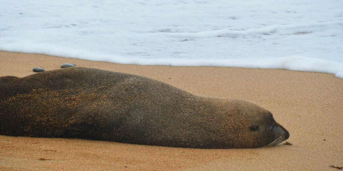 Von unserem Herbert Forest Campground steuerten wir zunächst das kleine Örtchen Oamaru an. Dort gibt es nicht nur einen tollen Aussichtspunkt, bei dem man einen super Blick über die Küste und die Stadt hat, sondern es ist auch das zu Hause der Gelbaugenpinguine. Als bekennende Langschläfer schafften wir es jedoch nicht, ein bis zwei Stunden nach Sonnenaufgang (wie in unserem Boomerang Reisen Tourenmanual eigentlich empfohlen war) dort zu sein. Wir bogen erst am späten Vormittag in die Bushy Beach Road ein. Dadurch, dass die Pinguine tagsüber auf Nahrungssuche in den Weiten des Ozeans unterwegs sind, stand unsere Chance die Meeresbewohner zu sehen gleich Null. In dem Wissen hatten wir natürlich keine großen Erwartungen die kleinen gefiederten Freunde anzutreffen. Ganz umsonst war der Besuch dort trotzdem nicht. Am Strand begegneten uns nämlich die coolsten Chiller der Ostküste, die wir auch einige Zeit beim Rekeln, Strecken und Schlafen beobachten konnten: